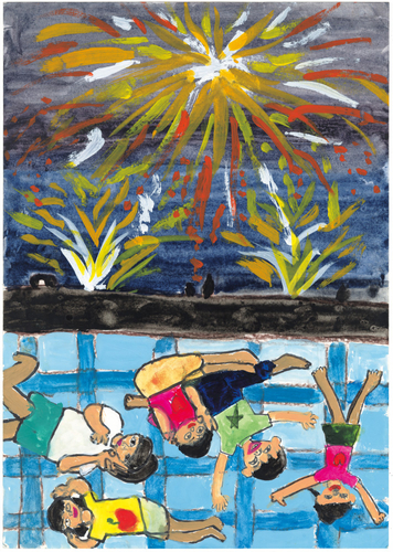 夜空に上がる花火と、それを見上げる子どもたちの歓喜を鮮やかに捉えた一枚です。天地が逆転したような構図が躍動感と浮遊感を生み、補色を使った花火表現も印象的。人物配置や床の模様も巧みで、画面に奥行きとリズムを与えた完成度の高い作品です。