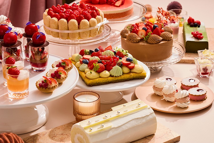 ホテルのペストリーチームが手がけるのは、見た目にも春らしいショートケーキやタルト、ムース、パフェなどの定番から、ベリーの酸味と甘みを繊細に組み合わせた創作スイーツまで、バリエーション豊かなラインアップ。さらに、スイーツの合間に楽しめるセイボリーも用意し、最後まで飽きることなくお楽しみいただける構成となっています。