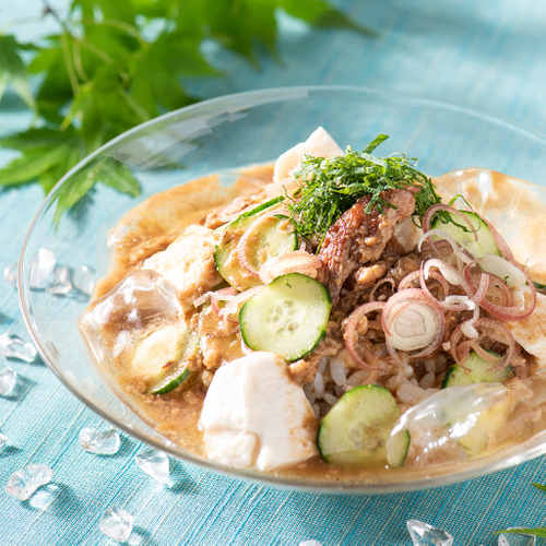 冷や汁はしっかりと冷蔵庫で冷やすのがポイント!熱々のご飯に冷やした汁をかけ、そこへお好みの具材や氷を乗せれば、食欲の落ちる暑い日でもさらさらと召し上がりいただける絶品冷や汁が完成します。具材は青じそやみょうが、きゅうりなどの夏野菜や香味野菜がおすすめです。刻んだピーナッツや柚子胡椒、豆腐を乗せてもおいしく召し上がりいただけます。