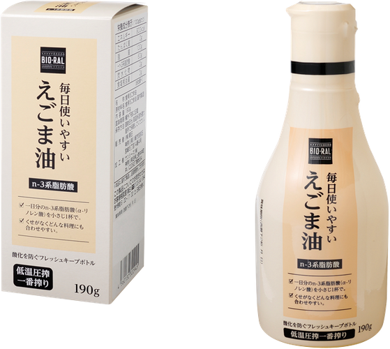 酸化防止ボトル容器を使用しており、普段使いしやすいえごま油。すっきりとした味わいで、1日分のオメガ3(α-リノレン酸)を小さじ1杯で摂ることができます。