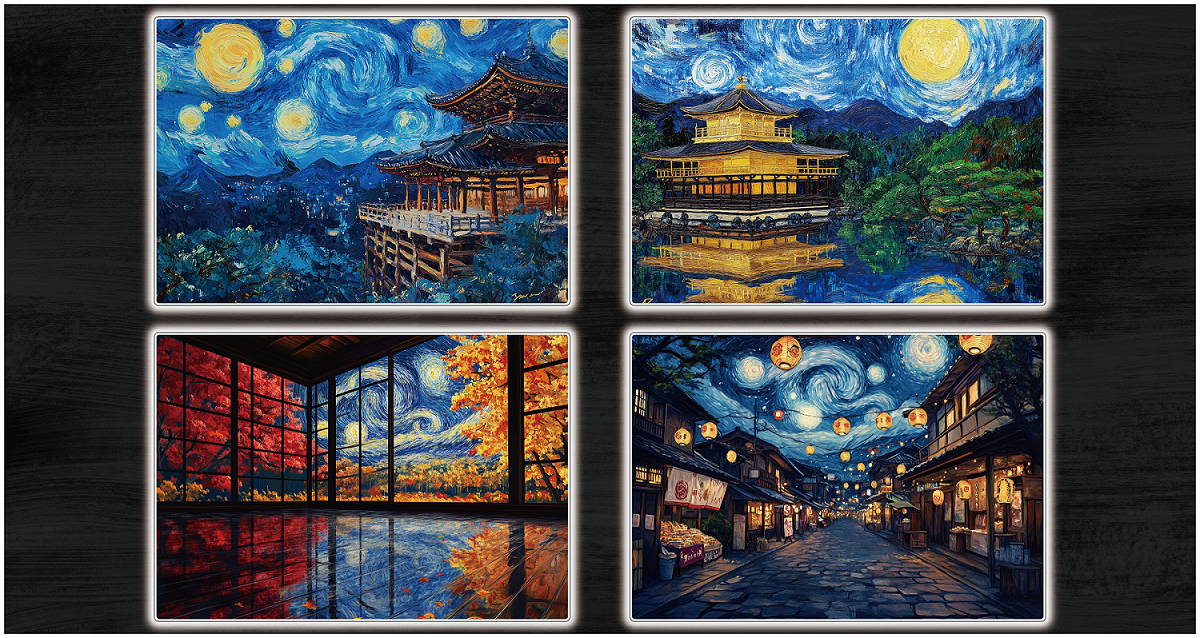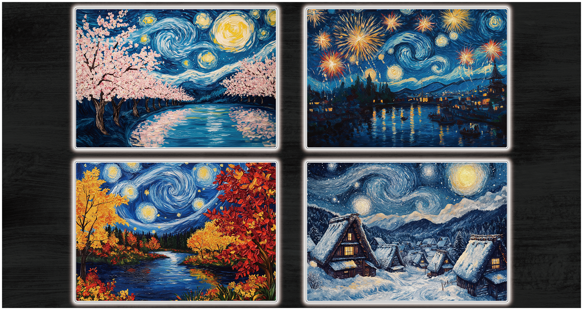 ゴッホの代表作「星月夜」を日本の四季や自然の情景と組み合わせ、全く新しいアートにしました。画像生成AIの技術を活用し、洗練されたデザインで他にはない癒しの空間を演出します。