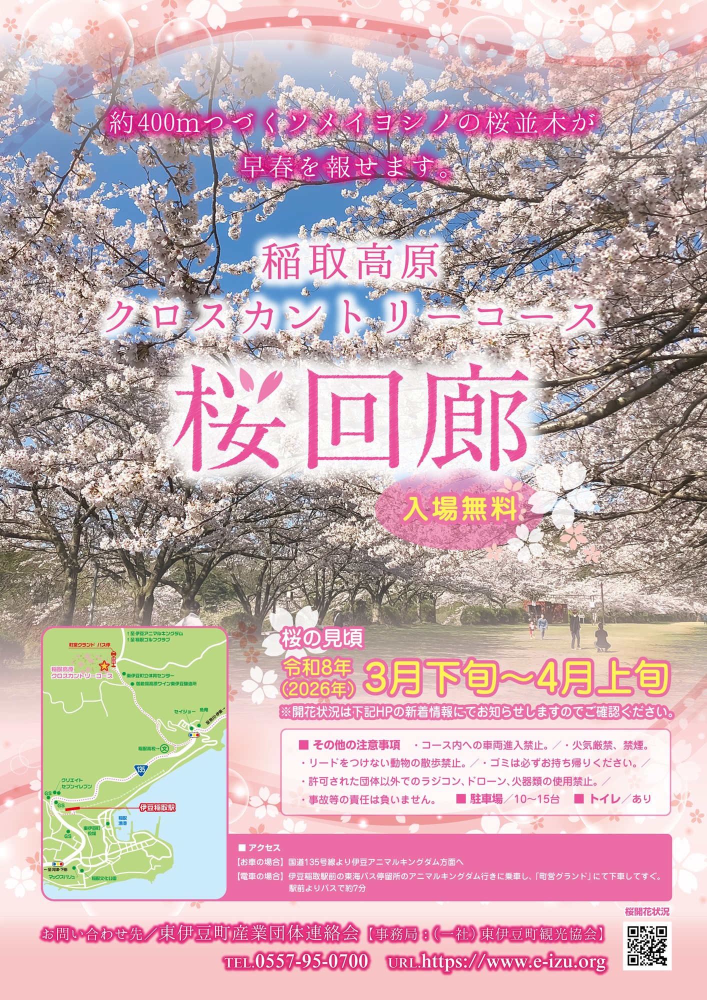 「桜回廊」は東伊豆町クロスカントリーコース内に約400メートル続くソメイヨシノの桜並木であり、広いコース内をハイキングをしながら、地域住民や観光客の方が桜を自由に観賞することができます。期間中の特定日にはキッチンカーの出店が予定されており、高原内での飲食もお楽しみいただけます。また会場付近にはホワイトタイガーを観賞できる「伊豆アニマルキングダム」や伊豆半島ジオパークに認定された「稲取細野高原」などの観光スポットもございます。春だけしか見られない伊豆半島の桜スポットに是非お越しください。