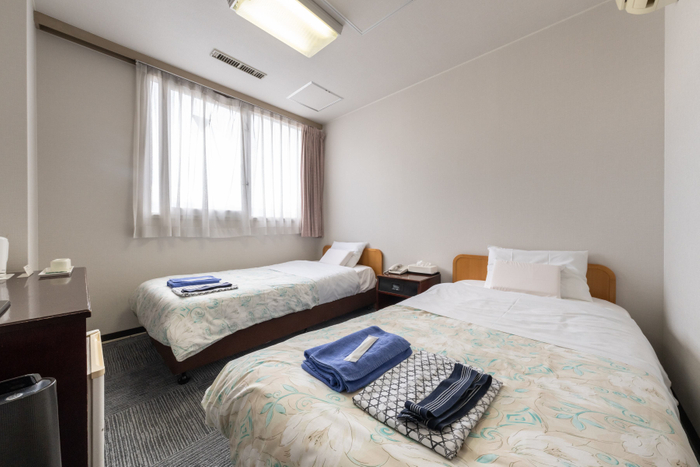 ツインベッド仕様の客室(左)と、ゆったりと過ごせる和室客室