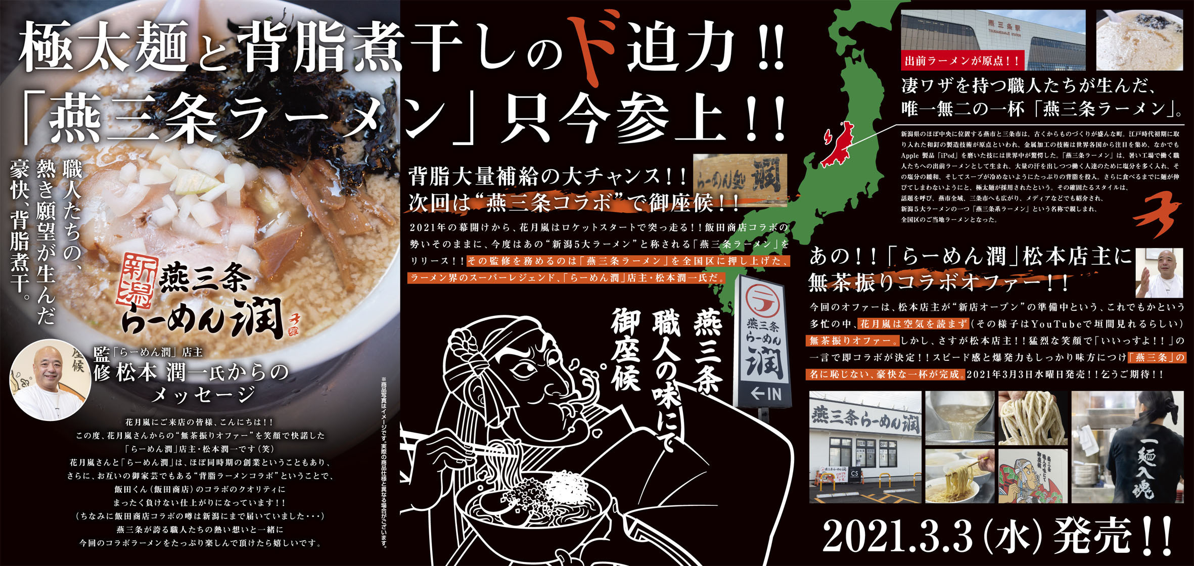 「ラーメンは世界に誇る日本のエンターテインメントである」をコンセプトに「らあめん花月嵐」のブランド名で、222店舗(海外24店舗含む)を運営するグロービート・ジャパン株式会社(本社 東京都杉並区)は、『新潟燕三条らーめん潤』を2021年3月3日(水)より期間限定で販売します。