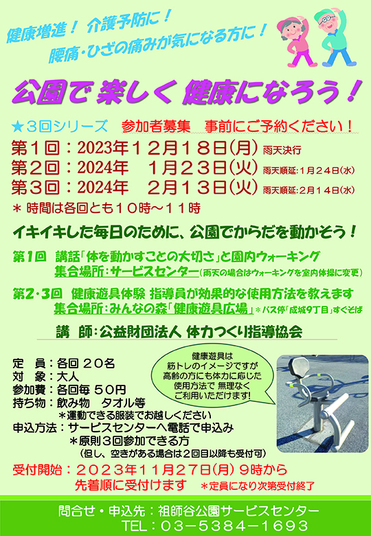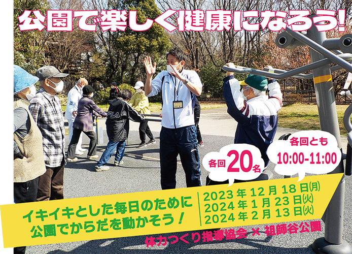 祖師谷公園では「体力つくり指導協会」の指導員さんが、効果的な健康遊具の使い方を教えてくれるイベントを開催します!