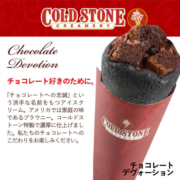COLD STONE CREAMERY(コールド・ストーン・クリーマリー)は、アメリカ発、世界に展開するアイスクリームショップです。−9℃に冷やした石板(コールドストーン)の上でアイスクリーム、ナッツ、フルーツをお客様の目の前でミックス。フレッシュで楽しいアイスクリーム体験を提供します。