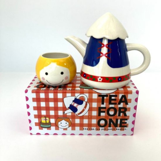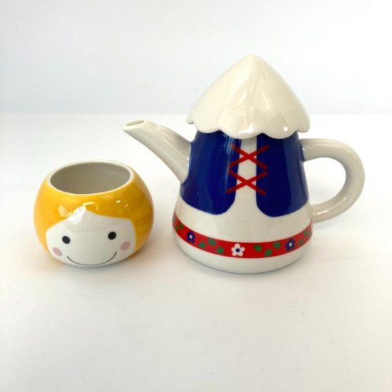 チロル少女なティーフォーワンです。これめちゃめちゃ可愛くないですか?ちょっとレトロ感があって飾ればあっという間にインテリアです。海外の民族衣装って可愛いですよね。ポットの下に描かれたお花もレトロで可愛い♪