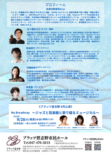 習志野大久保未来プロジェクト株式会社主催、『弦楽四重奏団drop 目からウロココンサートVol.4』が2025年8月9日(土)に習志野市民ホール(プラッツ習志野)(千葉県習志野市本大久保3丁目8-19)にて開催されます。