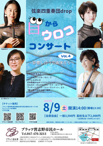 全国各地で好評を博している 弦楽四重奏団drop「目からウロココンサートVol.4~影響し合う芸術家たち~」8月9日(土)プラッツ習志野市民ホールにて公演決定!!