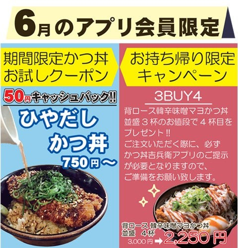 多くのお客様に「ひやだしかつ丼」の美味しさを知ってもらいたい想いを込めて、かつ丼吉兵衛アプリにて6月限定で「期間限定かつ丼お試しクーポン」を配信しております。