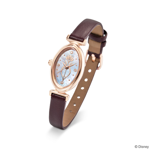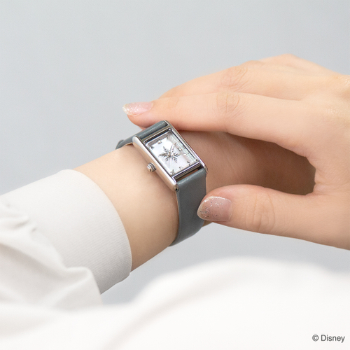 このほどの新作は、雰囲気も性格も異なるけれども、お互いを信頼し合い助け合う「アナ」と「エルサ」を、それぞれのデザインで表現しました。「アナ」のデザインはピンクゴールドカラーのオーバル型で、文字盤にはドレスに描かれている植物のような模様をほどこし、衣装からイメージしたボルドーカラーの革製ベルトを使用した腕時計です。「エルサ」のデザインはシルバーカラーのスクエア型で、文字盤には雪の結晶をデザインし、ブルーグレーのベルトを使用しました。ベルトにはプレーンなシームレス素材を用いており、シックな印象。どちらも落ち着いた色味で、インデックスの12.3.6.9時の箇所にはダイヤモンドを留めた、大人のジュエリーウォッチです。