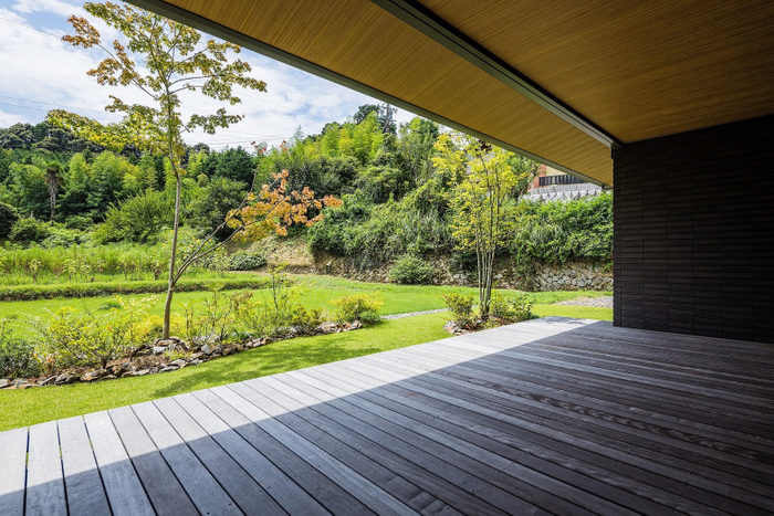 ウッドデッキからつながる庭には、あえて柵を設けず、元々田畑だった実家の土地とつながっています。庭づくりにあまり興味がなかった夫・Yさまですが、豊かな自然と一体化した庭に芝生と草木を植えてからは、庭の手入れが趣味になったと言います。