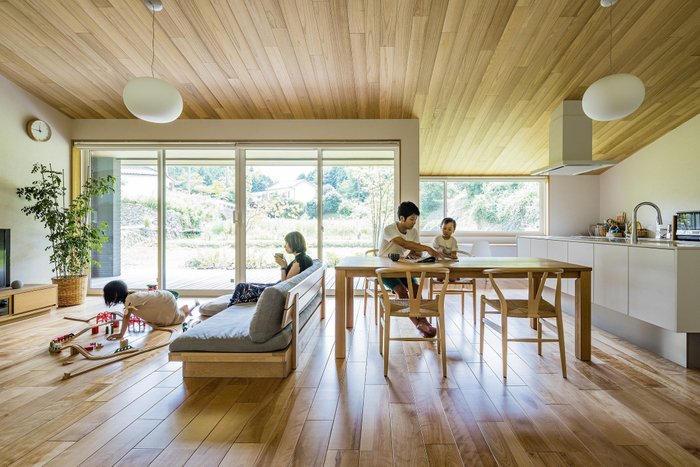 リビング、キッチン、畳コーナーがつながっていて、南側の大きな開口からは、自然光がたっぷり入ります。リビングにいながら、庭から畑・山へと広がる緑豊かな風景も楽しむことができます。さらに、LDK全体が吹き抜けからの勾配天井になっているほか、梁もないことから圧倒的な開放感をもたらしています。