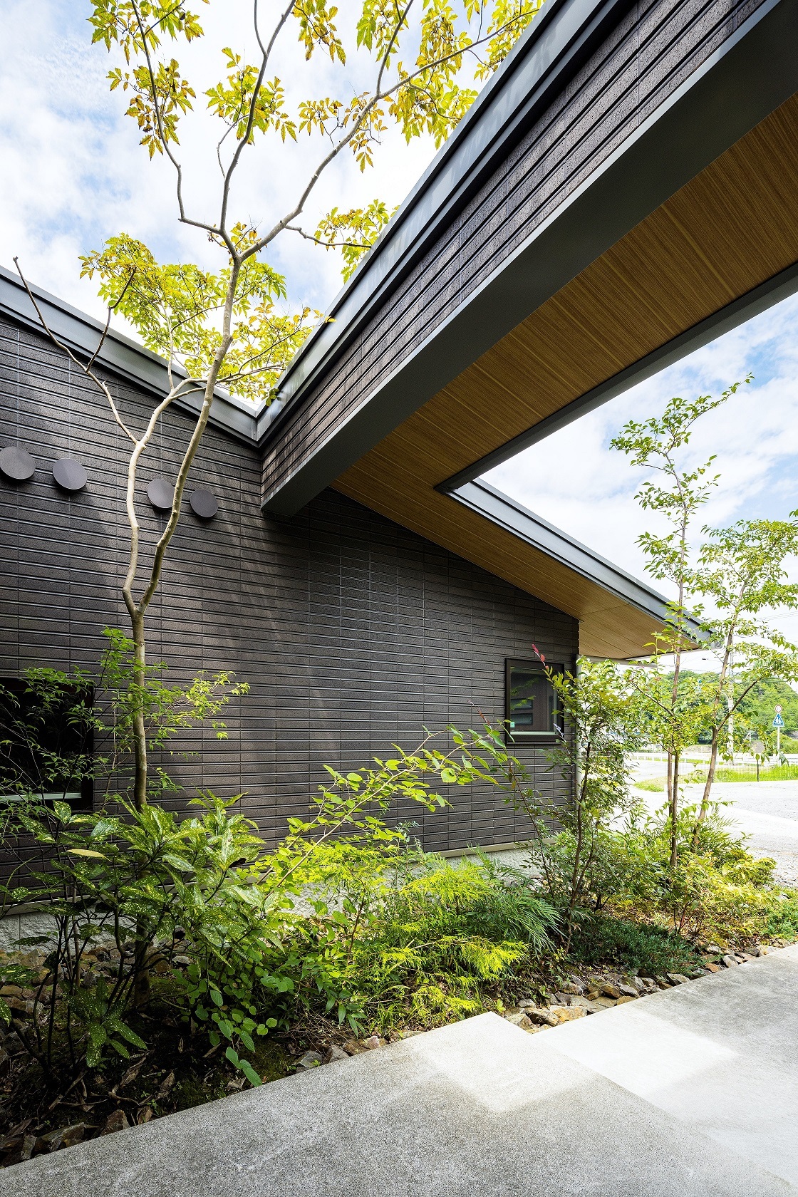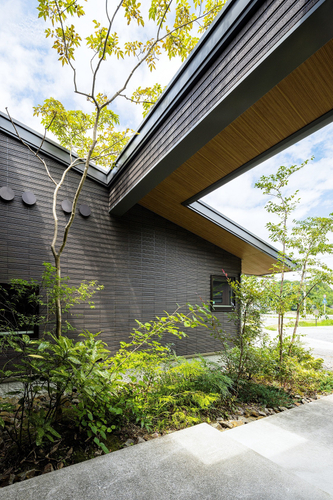 自然に囲まれていることから、自然との一体感が生まれるよう、玄関アプローチにライトウェル(屋根開口)を設けました。前栽の緑が建物と調和し、ライトウェルからも枝先が覗いており、美しい佇まいをつくっています。