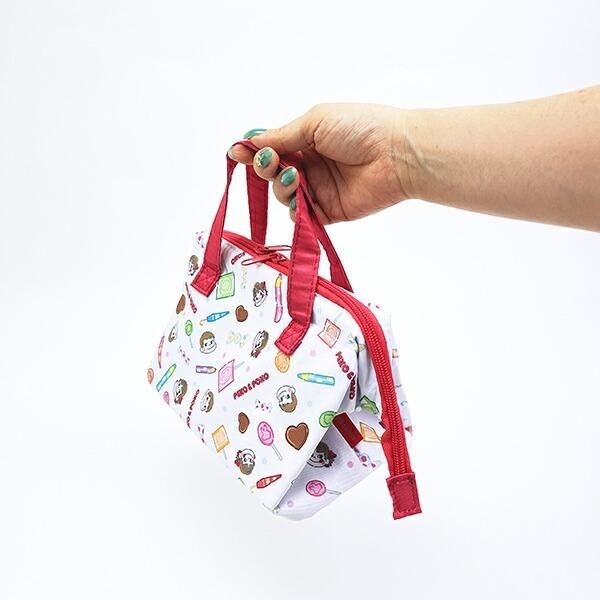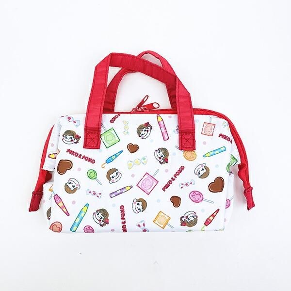 お弁当をもっていくバッグも勿論、ペコちゃん!こちらは、がま口ランチバッグです。キャラクターとお菓子のポップなデザインが見ていて楽しくなるデザインです。