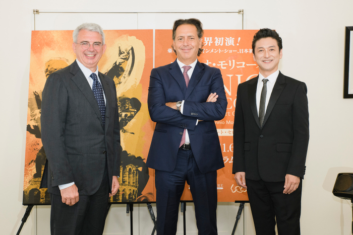 会見はジャンルイジ・ベネデッティ駐日イタリア大使からの記者の皆さんへの『ようこそおいで頂きました』の挨拶から始まる。続けて『いまだかつて誰も見たことのない唯一無二のコンサートだと伺ってます』と公演を称え、『コンサートは嬉しいことに、ここ東京から始まります!』世界初演が日本で開催されることに喜びを隠し得ない。『昔からのファンに加え、新しいファンへもモリコーネの音楽が魅了できたらと思います』と話し、最後は『偉大なモリコーネの音楽をここ日本で偲ぶことが出来たらと思っています』と結んだ。