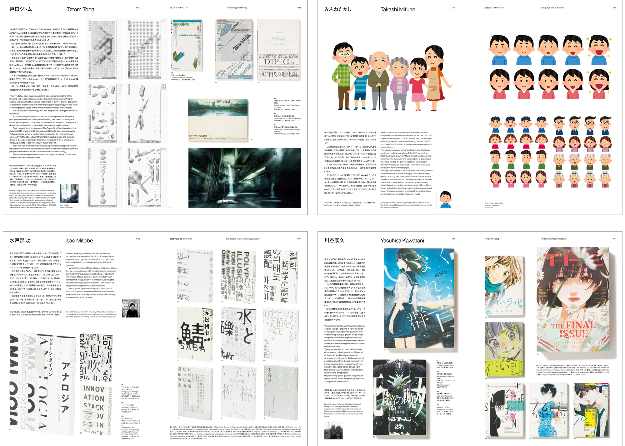 Ⅲ:論考 古賀弘幸「転用と一元化:日本語のマルチ・モーダリティとグラフィックデザイン」、阿部卓也「戦後日本のデザイナーと文字表現」、ばるぼら「平成・令和の文字と表現:規範と逸脱のあいだで」