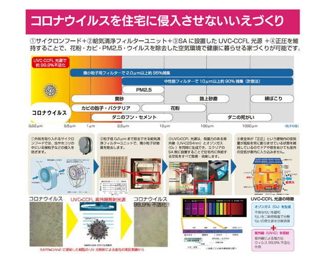 日本シン・光源(株)と国立大学法人神戸大学が、関西国際空港や医療機関。大手ショッピングモールなどに提供した最新技術 “UVC-CCFL(紫外線照射光源)” を採用した空気清浄化ユニットです。この空気清浄化ユニットを「Smart2030 零和の家®」のノウハウ販売を行う株式会社絆ジャパンと、エスイーエー株式会社(株)の展示場「絆ラボ」※にて実証実験を行い、住宅用に転用・開発されました。また、日本シン・光源(株)と国立大学法人神戸大学の共同研究にて行われた実証実験では、新型コロナウイルスを 99.9%不活化するという結果が出ています。