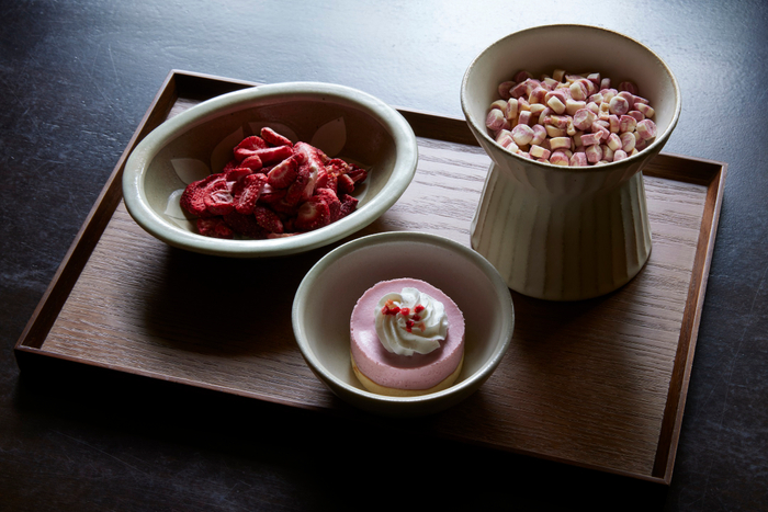 ペットルームには、愛犬が快適に過ごせるよう、栃木県の伝統工芸品である益子焼のフードボウルを設えます。益子焼のフードボウルは適度な重さと安定感があり、愛犬の首や食道に負担がかかりにくい高さのあるデザインです。愛犬用に提供するおやつは、クッキーやフリーズドライ、ムースケーキなど、見た目もかわいらしいいちごのドッグフードです。愛犬もおやつでいちごを楽しめます。