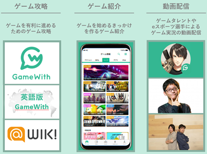 当社は国内最大級のゲームメディア「GameWith」等を運営し、新たにゲームを始めるきっかけとなる新作ゲーム紹介や、ゲームの上達をサポートするゲーム攻略を行っており、ゲームをより楽しむために必要な情報や機能を提供しています。また、専属のゲームタレント及びeスポーツ選手が動画プラットフォーム上で行う「動画配信」等を行っています。