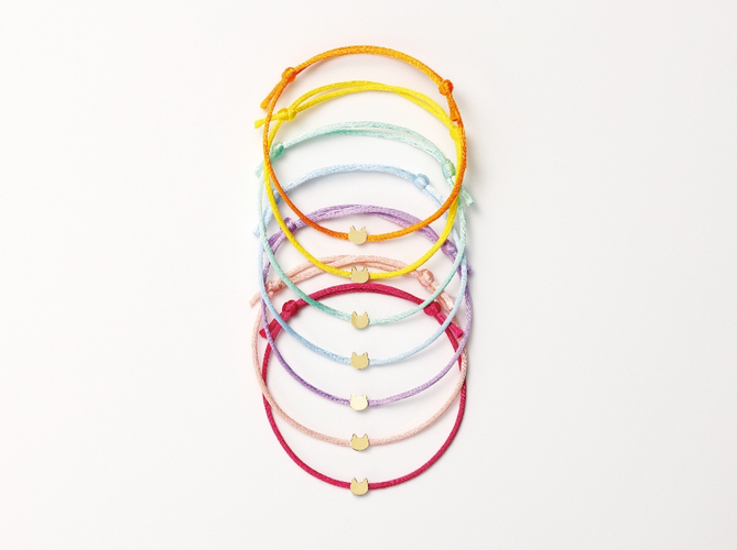 まんまるなお顔とピンと立った耳がキュートなネコのコードブレスレット。プレートの素材はK10YG[10金イエローゴールド](定価¥3,960)