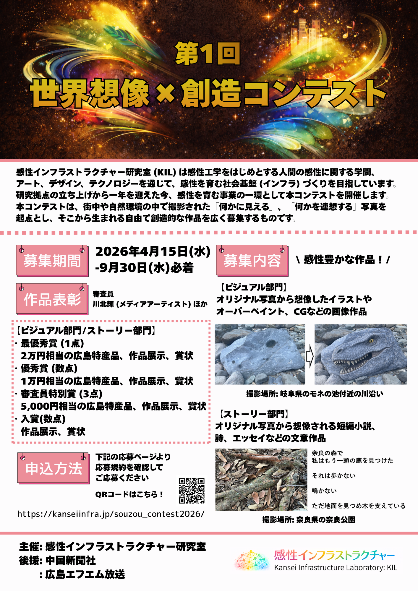 感性インフラストラクチャー研究室 (KIL: 代表 川北輝)は、「第1回 世界想像×創造コンテスト」を開催中です。本コンテストでは、街中や自然環境の中で撮影された写真をもとに、「何かに見える」、「何かを連想する」といった感性を起点とした創造的な作品を募集します。