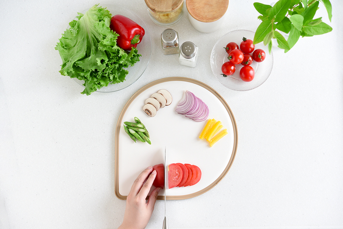 これまでの一般的なまな板のカタチを見直し、丸いまな板と四角いまな板の「いいとこ取り」をすることで、作業効率の良い「しずく型」のまな板ができました。