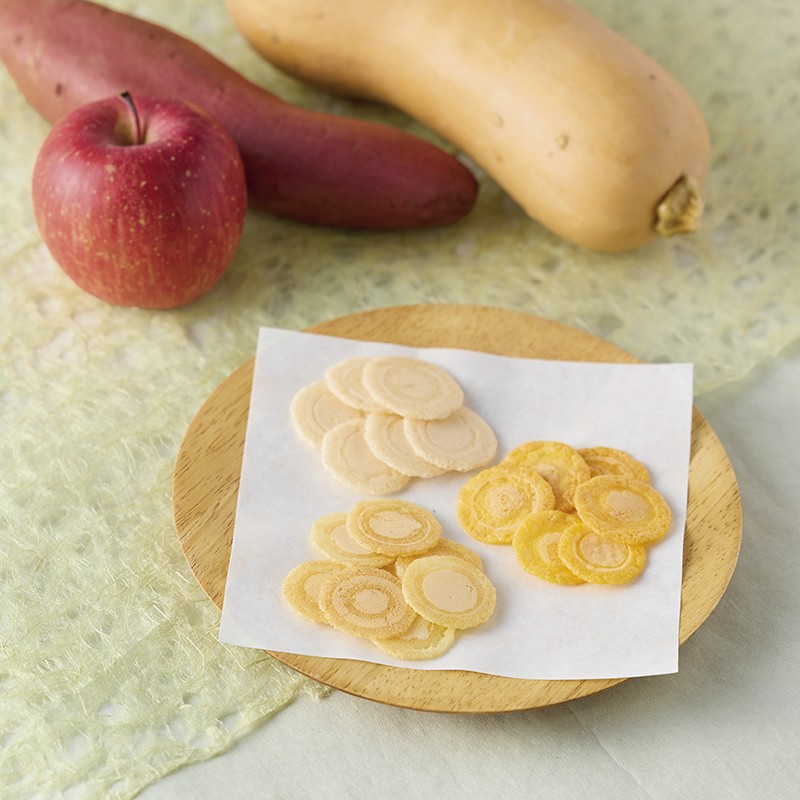 素材のやさしさにこだわった、食材と米粉だけでつくる手焼きせんべいも新登場しました。サクサクとした軽やかな食感で、手で割りやすく、ごほうびやコミュニケーションおやつにもぴったりです。画像では、「米粉のおやつシリーズ」として、食材の風味を活かした複数フレーバーが展開されています。蒸して甘さを引き出した食材と米粉を合わせて丁寧に仕上げた、シンプルなおやつです。