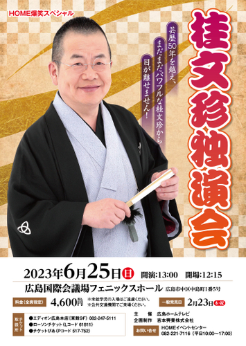広島ホームテレビ(所在地:広島県広島市)は、主催で2023年6月25日(日)「HOME爆笑スペシャル 桂文珍独演会」を広島国際会議場フェニックスホールで開催いたします。
