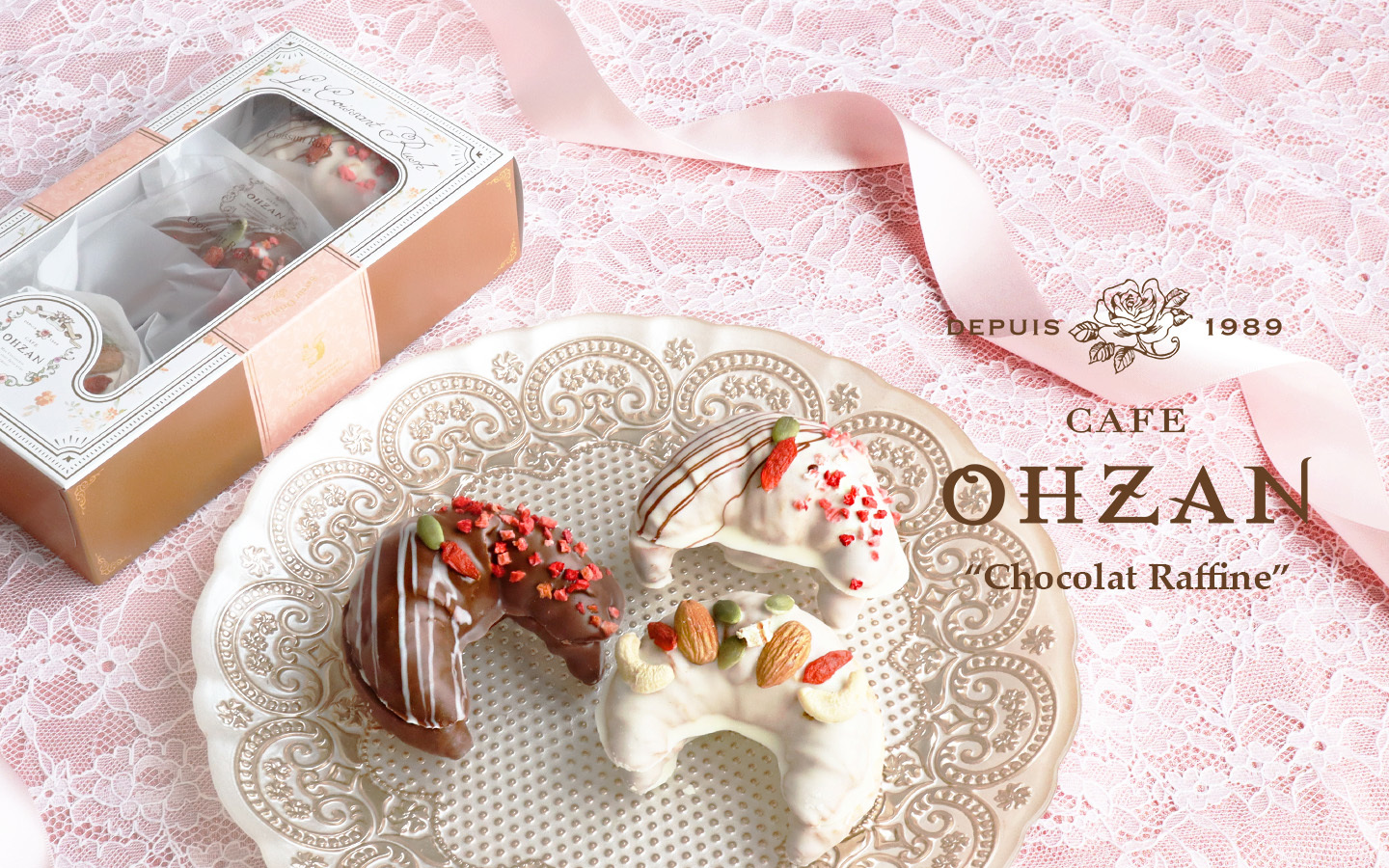 バターの風味が豊かなクロワッサン生地をラスクに焼き上げ、ベルギー産チョコレートをたっぷりとかけて製造。国内工場で手作りされたラスクは、贈答品として高い評価を得ています。クロワッサンラスクは、その華やかなビジュアルでも話題となる、CAFE OHZANの看板商品です。
