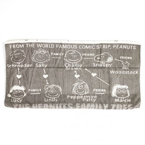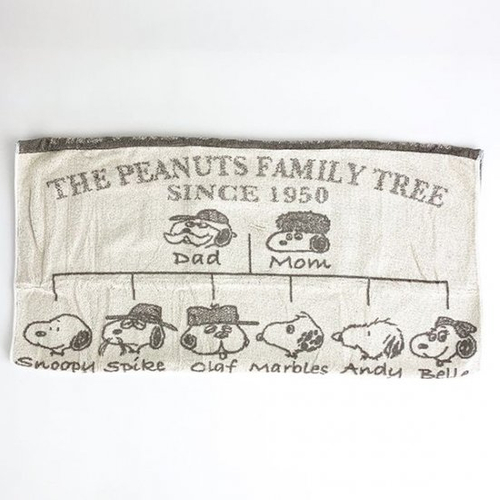 最近人気の、ブラザーズデザインもご用意しています。ベージュのタオル地に、スヌーピーの家系図がデザインされています。パパやママまでいるレアなデザインですね。