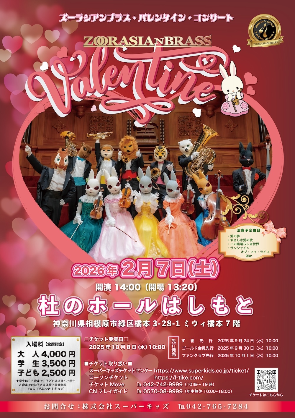 ズーラシアンブラス(制作会社:株式会社スーパーキッズ)は、2026年2月7日(土)に「ズーラシアンブラス・バレンタイン・コンサート」を、杜のホールはしもと(相模原市緑区)にて開催いたします。