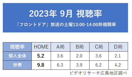 広島ホームテレビ「フロントドア」2023年度上期・7月クール・9月月間視聴率 同時間帯1位を獲得!
