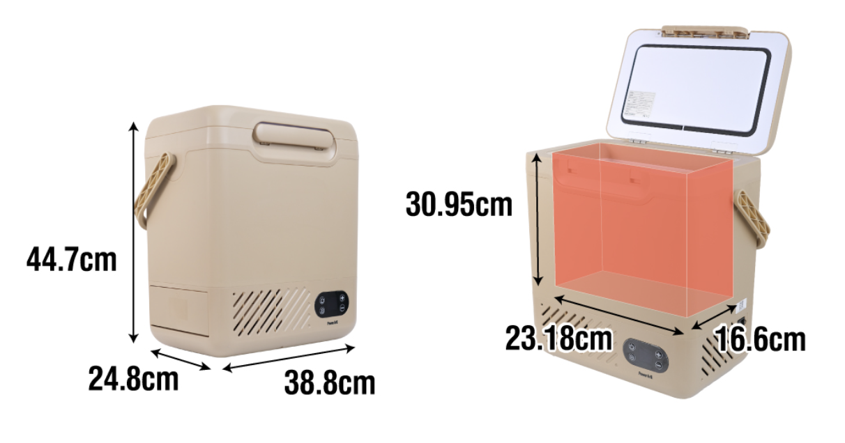 本製品は、人気のポータブル冷蔵庫ICEBERGシリーズを踏襲し、使い勝手のいい容量12Lを採用しました。家庭用冷蔵庫と同じコンプレッサー式採用で、-20℃まで冷却可能。38.8×24.8×44.7cmとコンパクトなので、デスク下、車のシートの隙間にも収納できるサイズ感です。別売りバッテリーの使用で、コードレスでも使用可能。カラーはPowerArQを象徴する「コヨーテタン」1色展開です。
