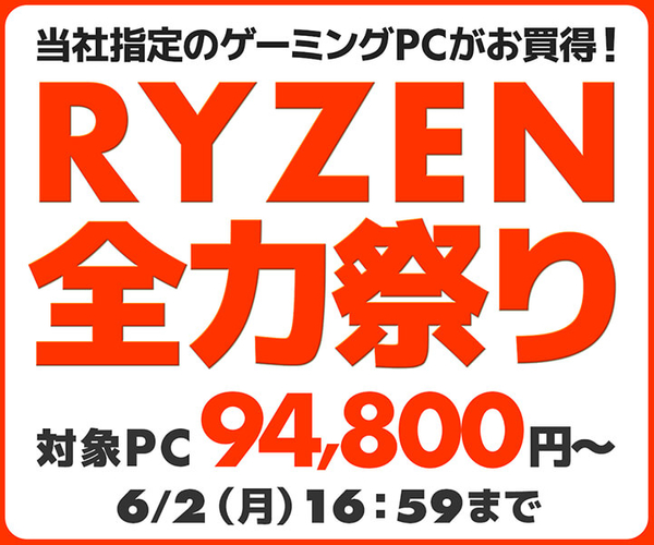 パソコン工房では、ただいま「RYZEN全力祭り」を開催中です! 当社指定のRyzenプロセッサーを搭載している対象BTOパソコンが6月2日(月)16:59までの期間限定でお得に手に入るチャンスとなりますので、この機会をお見逃しなく!