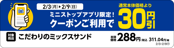 【キャンペーン内容:ミニストップアプリ限定!クーポンご利用で対象のサンドイッチ本体価格より30円引き】