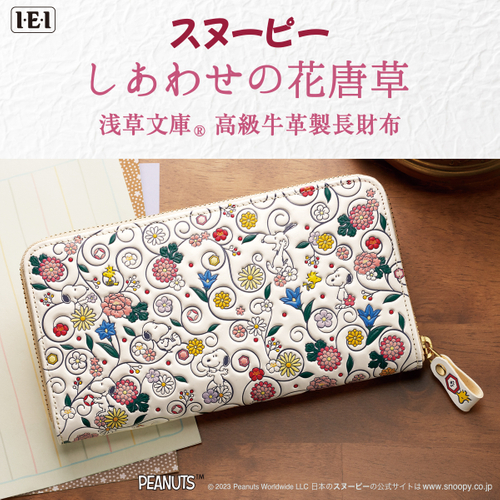 浅草文庫高級牛革製長財布<スヌーピーしあわせの花唐草>は、I・E・I オリジナルショップにて販売中です。