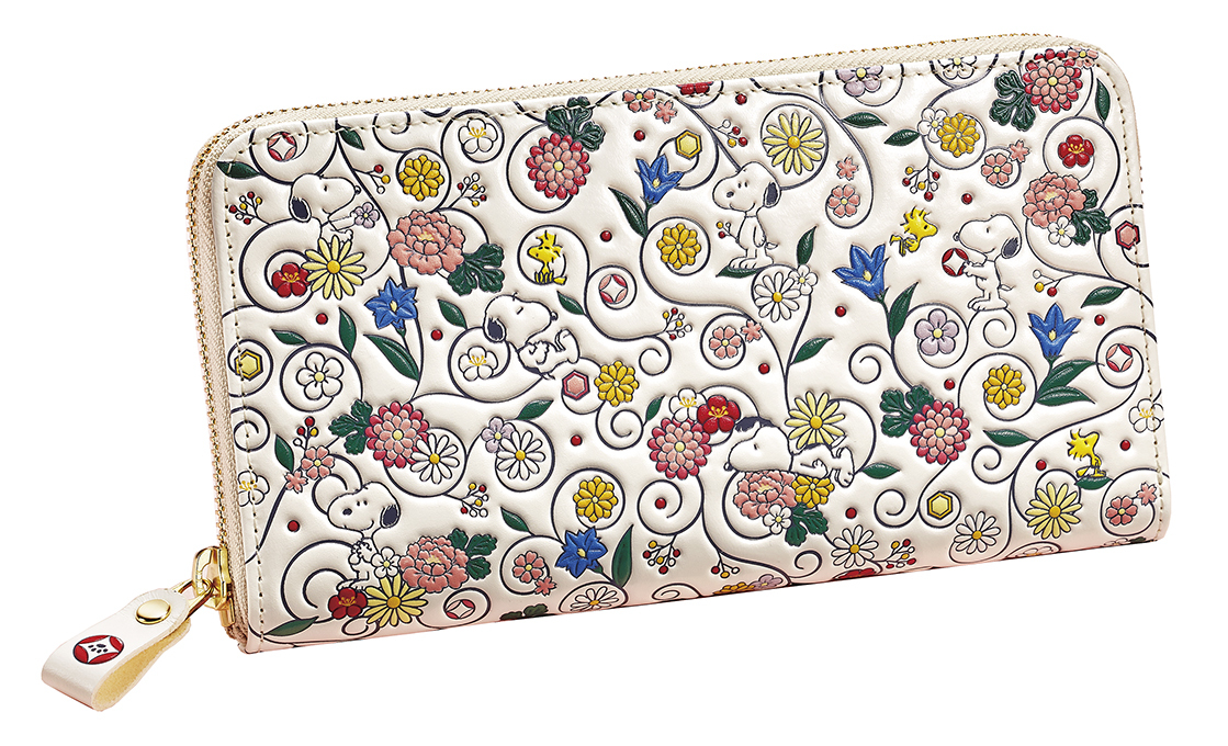 浅草文庫長財布<スヌーピーしあわせの花唐草>新登場! 播播州姫路特産の白革に、色鮮やかな友禅染めの逸品が誕生しました。