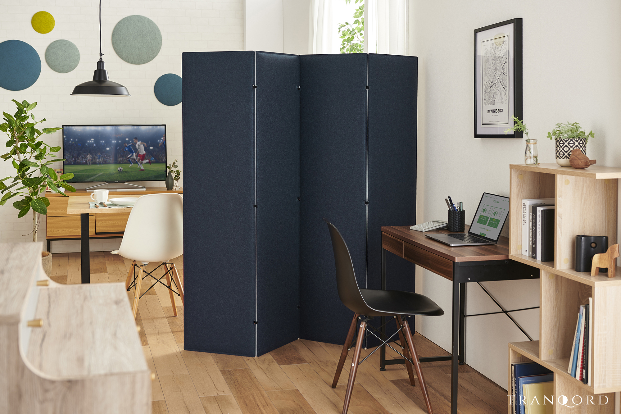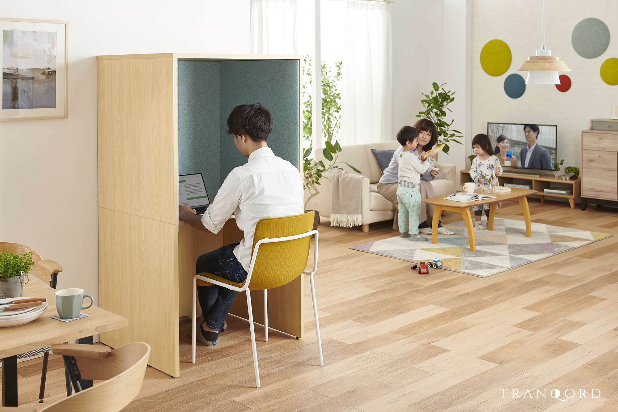 視線を遮るだけでなく、囲われた空間の内外の音をTRANQORDが吸音し和らげることで、自宅内でオンとオフが混在することによる気疲れを解消し、完全な分離とは違った家族との心地良い距離感を作り出します。
