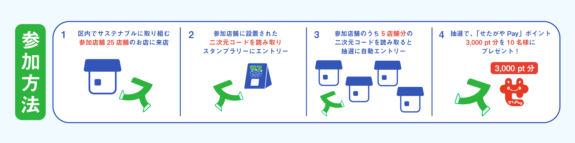 ●参加方法:各参加店舗に設置された、サスセタ卓上POPから二次元コードを読み取り、スタンプを獲得。期間中、参加店舗のうち5店舗を訪れた方に抽選で、「せたがやPay」ポイント3,000ptを、10名様にプレゼントします!(当選者の発表は、12月下旬以降にポイント付与をもって代えさせていただきます。)