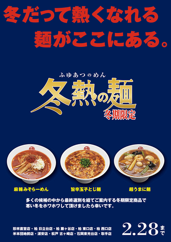 珍來の冬期限定フェア『冬熱の麺』は、“冬だって熱くなれる麺がここにある。”をテーマに、自社工場製多加水麺に絶妙にからむあんかけ麺を2品と特製のみそをシビ辛でお楽しみいただけるみそらーめんをご用意いたしました。いずれもモチモチの麺にカラダの芯から温まる心を込めた渾身の一杯を是非ご堪能下さい。