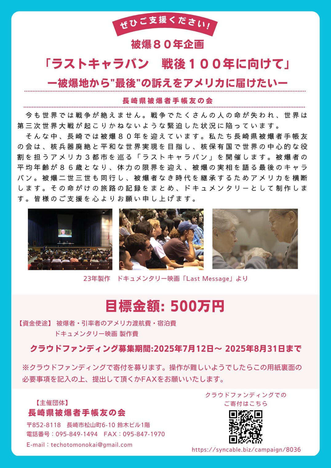 長崎県被爆者手帳友の会(所在地:長崎県長崎市、代表:朝長 万左男)は、高齢化する被爆者の「ラストキャラバン」を映像記録として残すプロジェクト実現のためのクラウドファンディングを、2025年8月31日まで実施します。