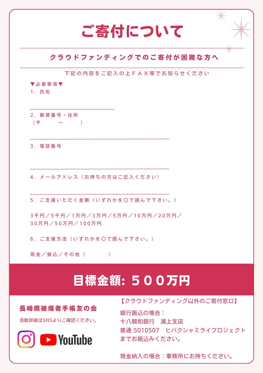寄付金は渡航費用・宿泊費・撮影機材費等、アメリカキャラバン活動費として使用されます。なお、世界情勢や自然災害等の影響により予定が変更となる場合、支援金は長崎県被爆者手帳友の会の今後の活動・運営費として活用されます。