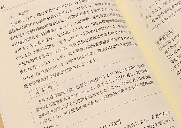 ◆判例をもとにして調査・説明の際のポイントを解説し、重要事項説明書の注記例についても掲載しています。