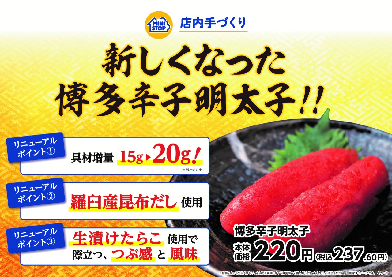 ミニストップは、味付けと製法にこだわった博多辛子明太子を、店内で炊いたご飯とあわせた、「手づくりおにぎり 博多辛子明太子」を、4月5日(金)より国内のミニストップ店舗にて発売します。 また、新しくなった博多辛子明太子を使用した「手づくりおにぎり 玉子焼き明太」「手づくりおにぎり 高菜明太」「おにぎりセット(しゃけ・明太子)」も発売します。(発売日は店舗により異なり、一部取り扱いの無い店舗がございます。)