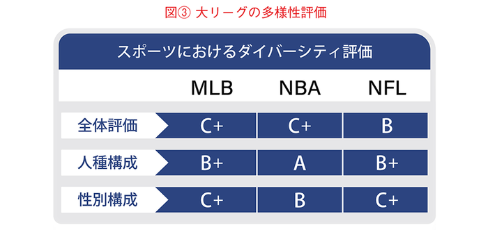 セントラルフロリダ大学の一部門である「スポーツにおけるダイバーシティと倫理機構」(The Institute for Diversity and Ethics in Sport:TIDES)が2021年4月1日に行った調査からは、NFLとNBAと比較して大リーグの多様化が遅れていることが分かります。*TIDESでは主要プロスポーツや大学スポーツにおける「人種構成」「性別構成」「全体評価」を検証し、毎年報告書を公表している。評価は最高の「A+」から最低の「F」まで12段階あり選手や指導者・経営者の人種、性別などを詳細に調査し、評定している。
