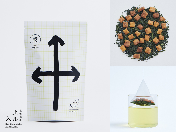 玄米茶の原点を再現した、縁起のいい玄米茶専門ブランド。玄米茶のはじまりは、昭和初期に京都のある茶商が鏡餅を割った際に出た細かい欠片を炒ってお茶に混ぜたことであるとの言い伝えがあります。現在の一般的な玄米茶は炒り米をブレンドしたものがメインですが、〈京玄米茶 上ル入ル〉はルーツである〝お餅〟にこだわり、備長炭炭火炒り餅をブレンドして原点を再現しています。