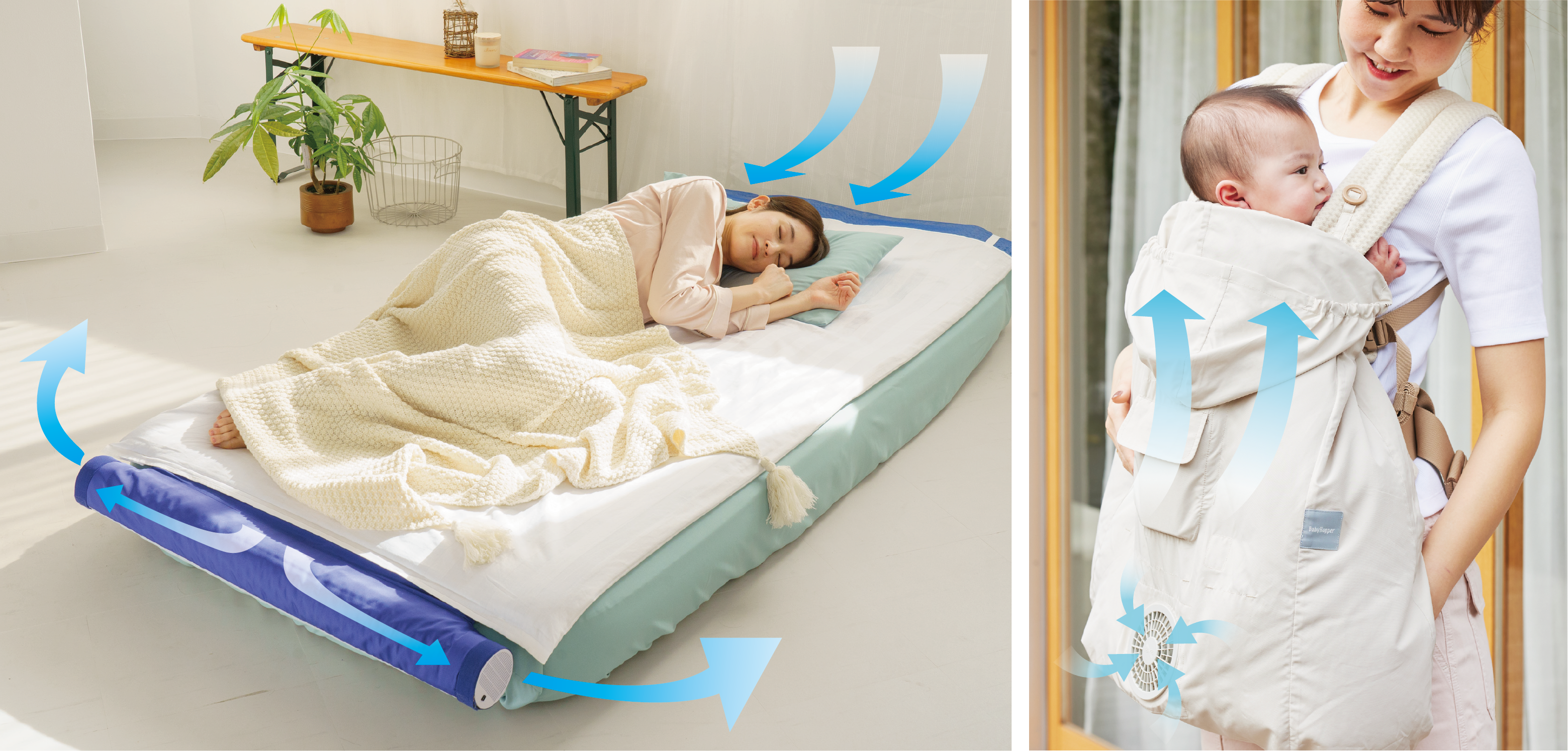 ファンから取り込んだ風がケープを通り抜け、汗が蒸発する際の気化熱で優しく身体を冷却。抱っこをしている方も涼しくお過ごしいただけます。