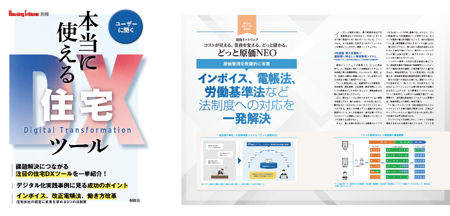 建設業界導入実績No.1※1の原価管理ソフト「どっと原価NEO」を開発・販売する株式会社建設ドットウェブ(本社:石川県金沢市、代表取締役:三國 浩明)は、住宅業界の情報雑誌『ハウジングトリビューン』の別冊へ掲載されました。2022年以降、ラッシュを迎えている建設業の法・制度改正への対応するためのソリューションとして「どっと原価NEO」および、連携ソフトである「クロノスPerformance(クロノス株式会社)」、「BtoBプラットフォームTRADE(株式会社インフォマート)」について紹介されています。