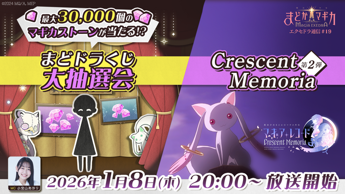 株式会社アニプレックス(本社:東京都千代田区 代表取締役 岩上敦宏 以下アニプレックス)は、『魔法少女まどか☆マギカ Magia Exedra』(Magia Exedra:マギアエクセドラ)の公式番組「魔法少女まどか☆マギカ Magia Exedra エクセドラ通信#19 まどドラくじ大抽選会&Crescent Memoria第2弾 最新情報SP」を1月8日(木)20時より生配信することを決定いたしました。